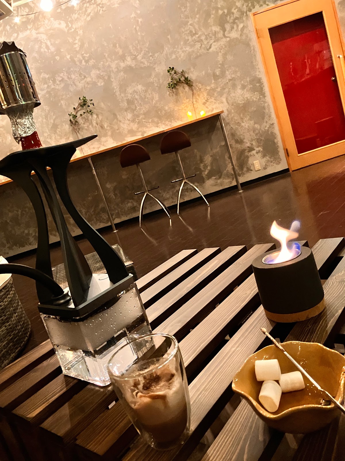 人情横丁向かいのビル2Fにゆっくりとした時間をくつろぐための夜カフェができます。 ソファや窓際のカウンター席に座って、シーシャや小さな焚き火を使ったスモアが楽しめます。 おひとり様、シーシャ初めての方、ドリンクのみのご注文でも大歓迎です。