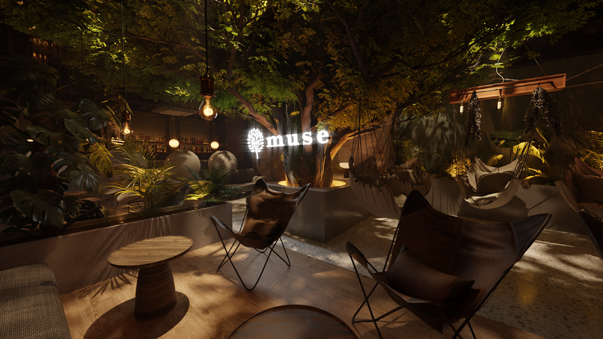 大きな木とそれを囲むソファーやハンモックでくつろげるシーシャカフェ。